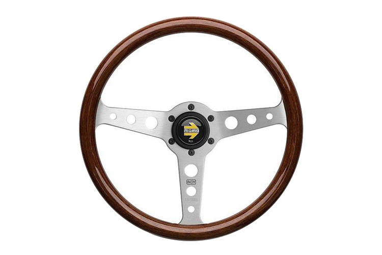 Classic MOMO sports steering wheel with a wooden rim.